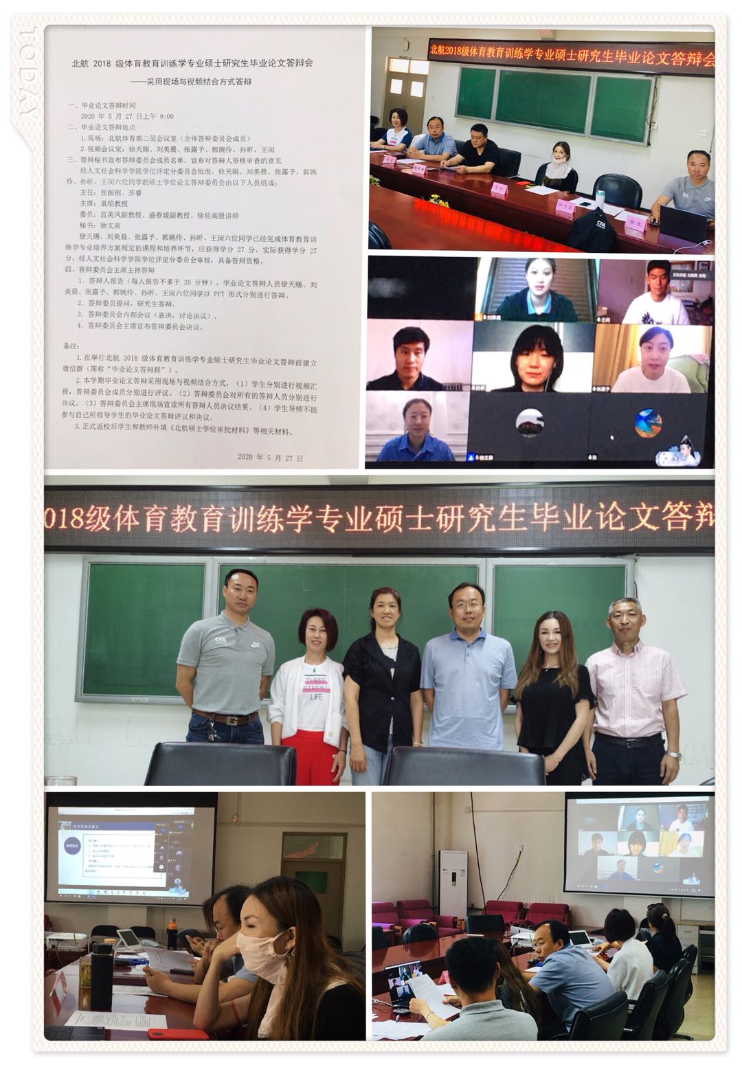 2020年5月27日上午9:00在北航体育部召开了北航2018级体育教育训练学硕士研究生学位论文答辩,本次学位论文答辩是经人文社会科学学院学位评定分委员会批准,依照北航研究生院、人文社会科学学院、体育部研究生办公室的相关制度和程序进行,出席本次学位论文答辩委员:张振刚、苏睿、袁焰、宫美凤、徐文泉、盛春媛、徐昆,答辩人员:徐天赐、刘美晨、张露予、郭婉伶、孙昕、王闵。