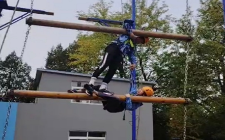 最先比赛的是勇攀天梯项目,翁至言、徐思璐凭借着良好的身体素质和心里素质,勇于挑战自我的勇气,在有限的时间里拼尽全力取得了第五名的成绩,极大的鼓舞了拓展队员的士气。